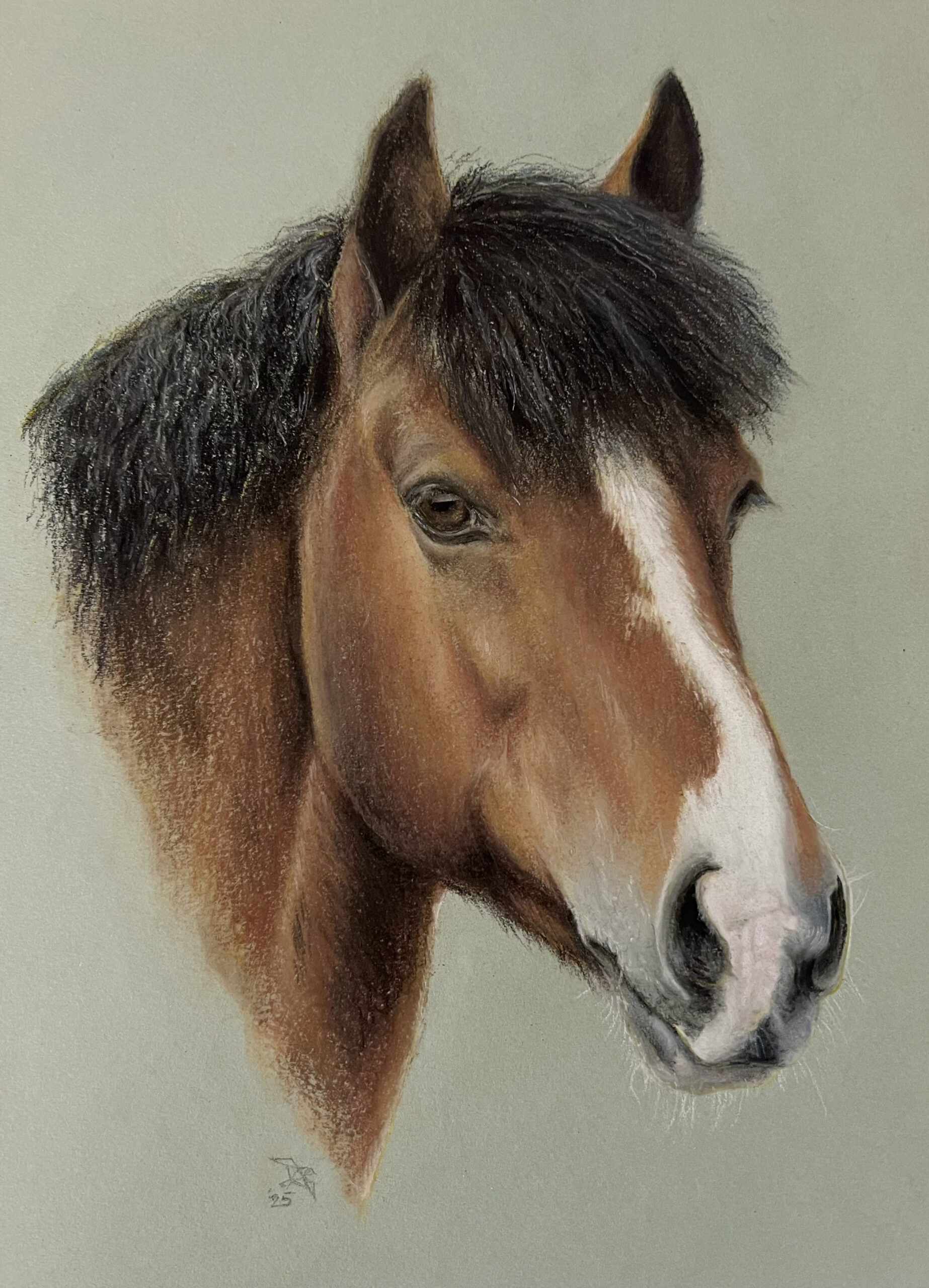 Die Pastellzeichnung des schönen Braunen steht auf dem salbeigrünen Papier besonders gut.